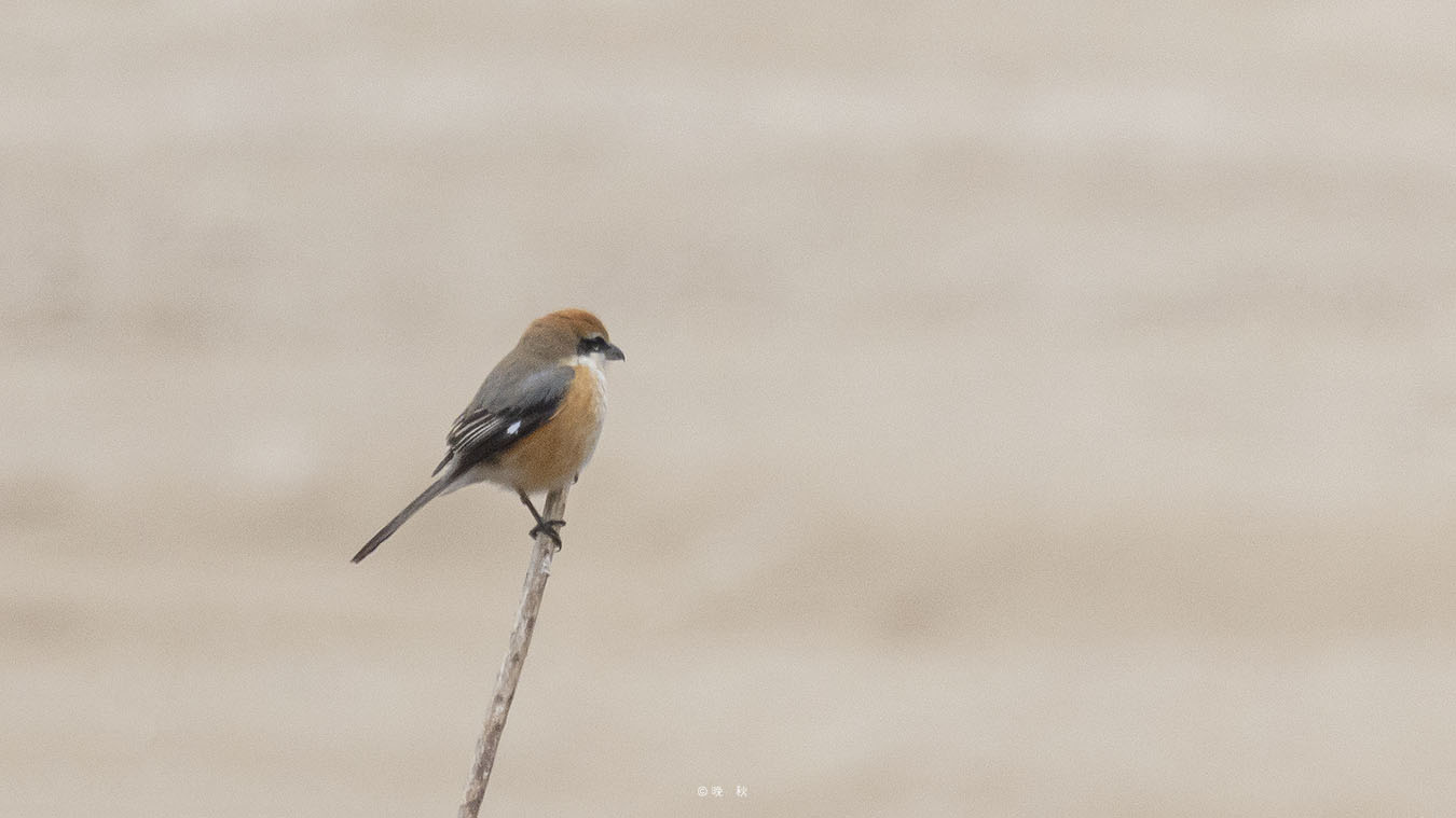 내려다 보이는 강변 금모래 를 배경으로 때까치 한마리와 딱새 한마리가 부러진 나무 위에 앉았있다.